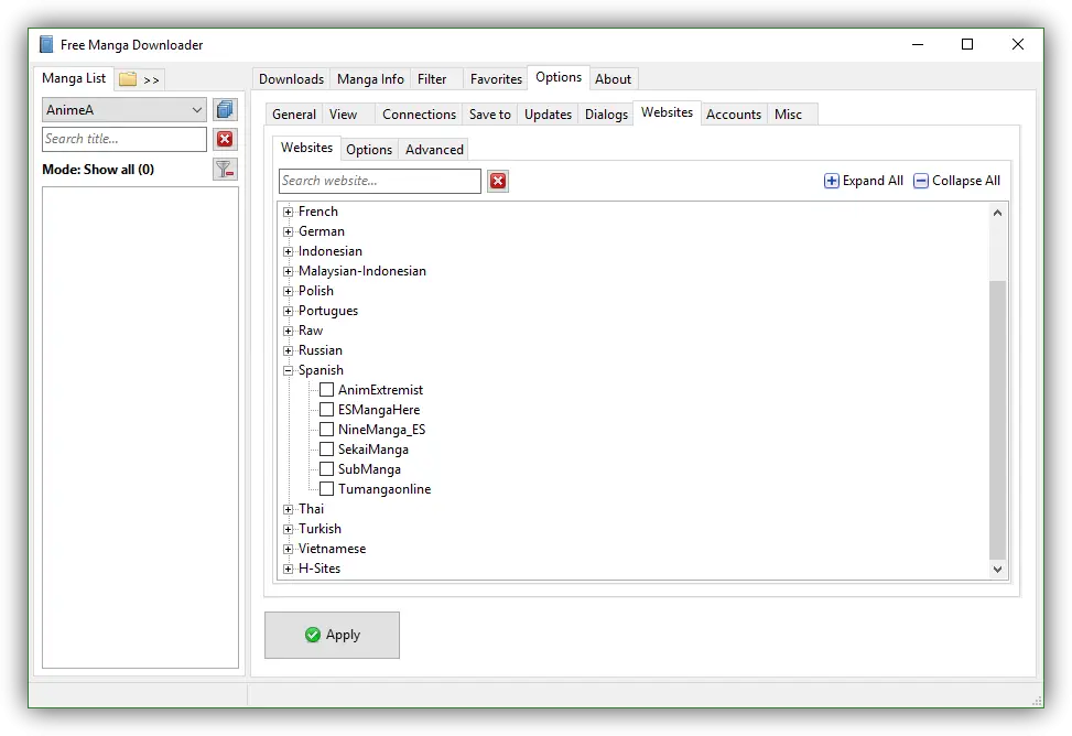 Par défaut, plusieurs pages Web avec un contenu en anglais sont activées, donc si nous voulons télécharger des mangas en espagnol, la première chose à faire est d’activer les pages dans notre langue. Pour ce faire, ouvrez l’onglet » Options » et, dans la section » Sites Web «, activez les cases » Espagnol «. Nous pouvons également désactiver les pages par défaut en anglais si nous n’allons pas télécharger à partir d’elles.