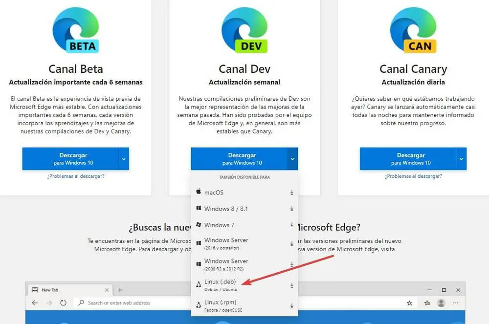 Il est à noter qu’à partir du site Web sur lequel nous commentons, le cabinet nous propose une liste déroulante qui apparaît lorsque nous cliquons dessus. Nous retrouverons ici toutes les versions des plateformes pour lesquelles le nouveau Edge Chromium a été développé. Comment pourrait-il en être autrement, nous voyons ici Windows 10, Windows 7 et 8.1. Ainsi, nous n’aurons plus qu’à cliquer sur l’option qui nous intéresse pour que le téléchargement de l’exécutable commence en tant que tel.