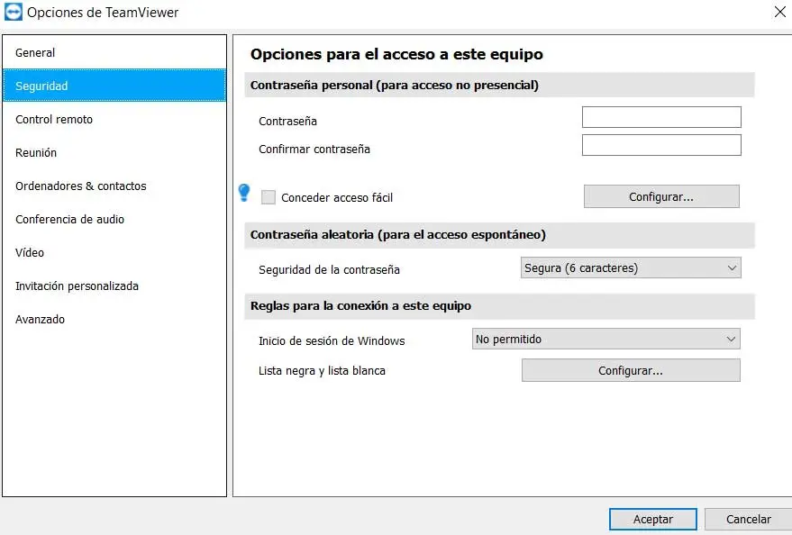 Ensuite, une nouvelle fenêtre apparaîtra sur l’écran qui, sur le côté gauche, montre les sections que nous pouvons personnaliser. Ainsi, par exemple, on retrouve tout ce qui touche à la sécurité . Ici, nous aurons la possibilité de spécifier un mot de passe fixe, ou simplement d’éliminer son utilisation. Nous indiquons également le degré de sécurité de cela, ou créons une liste noire d’ordinateurs auxquels nous ne voulons pas accéder à la nôtre.
