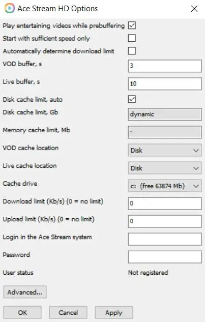 Paramètres de base d’Ace Stream
