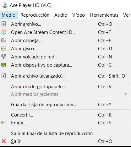 Mais bien sûr, comme il est facile de l’imaginer, lors de l’exécution du soi-disant Ace Player HD , bien que cela puisse paraître ainsi, nous ne sommes pas confrontés au VLC susmentionné, mais nous sommes confrontés à une application puissante pour lire du contenu en streaming. C’est quelque chose que nous pouvons réaliser grâce aux fonctions supplémentaires que les développeurs mettent à notre disposition. Ainsi, en fonction du contenu que nous allons utiliser, nous pouvons sélectionner certaines des options qui sont présentées dans le menu Média.