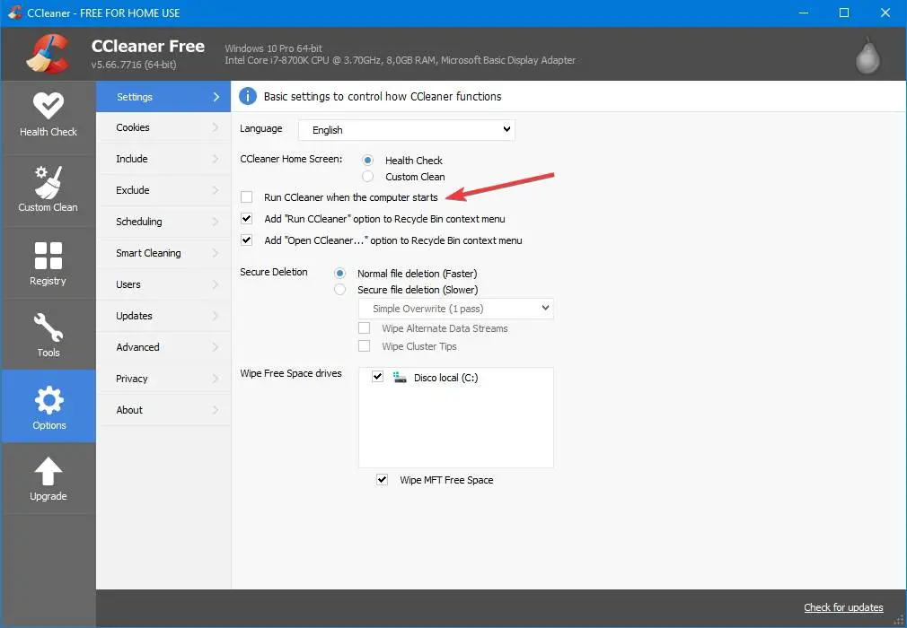 Nous devons également nous assurer que le programme n’est pas configuré pour s’exécuter automatiquement au démarrage de Windows , car si tel est le cas, il affichera toutes sortes de messages, d’avertissements et de publicités pendant que nous utilisons le PC. La meilleure chose est qu’après chaque nettoyage, nous fermons complètement CCleaner .