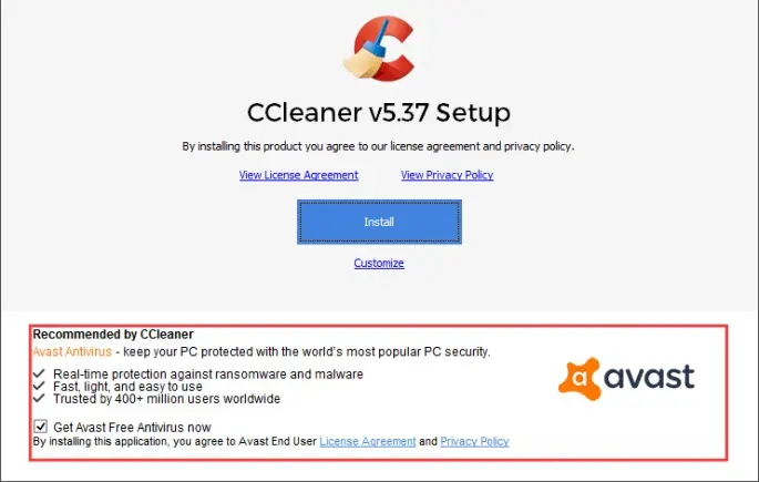 La deuxième des plaintes contre ce programme vient de la tentative d’introduire des logiciels publicitaires et indésirables sur les ordinateurs. CCleaner appartient à Avast, donc l’un des programmes que vous pouvez essayer d’installer est cet antivirus (qui désactiverait Windows Defender ou tout autre antivirus que nous avons installé).