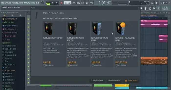 Une fois l’installation terminée, nous commencerons à exécuter le programme, en cliquant sur le raccourci que FL Studio 20 a créé pour nous, de cette manière, son menu principal apparaîtra avec toutes les fonctionnalités disponibles pendant que la période d’essai est opérationnelle. Si nous décidons finalement d’acheter votre licence, nous pouvons cliquer sur l’ icône du panier situé en haut à droite. Une fenêtre apparaîtra avec toutes les versions et les prix disponibles afin que nous puissions choisir celle qui nous intéresse le plus.