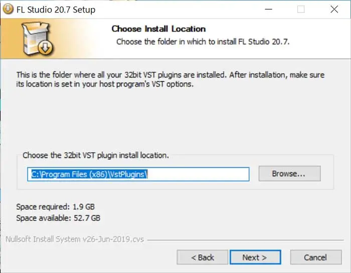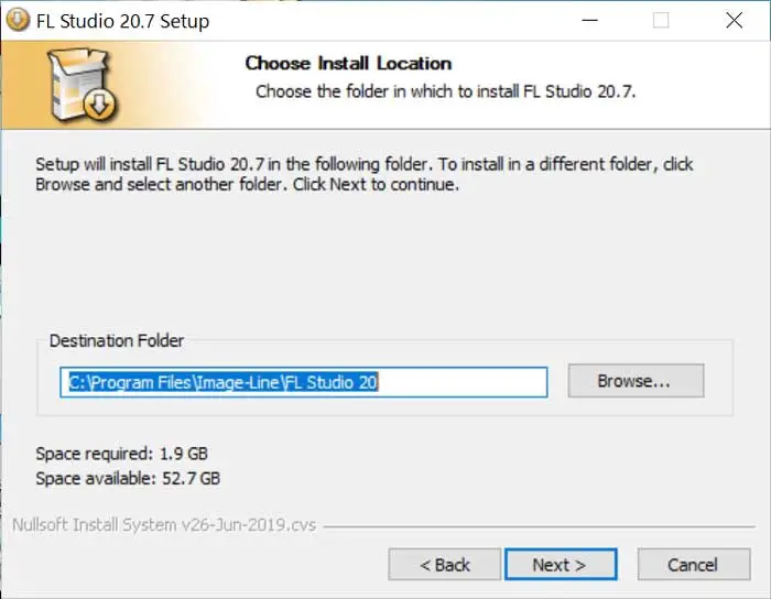 Nous continuons avec les préparatifs pour l’installation, nous devons choisir le dossier de destination où l’application sera installée. Par défaut, l’installateur nous propose le chemin C: Program-FilesImage-LineFL Studio 20 . Il nous informera également, encore une fois, qu’il occupe 1,9 Go, ainsi que l’espace dont nous disposons sur notre disque dur. Si nous voulons changer le chemin d’installation, nous pouvons l’utiliser en cliquant sur «Parcourir» pour sélectionner le répertoire souhaité. Plus tard, sur l’écran suivant, nous devrons accepter le chemin pour installer les plugins .