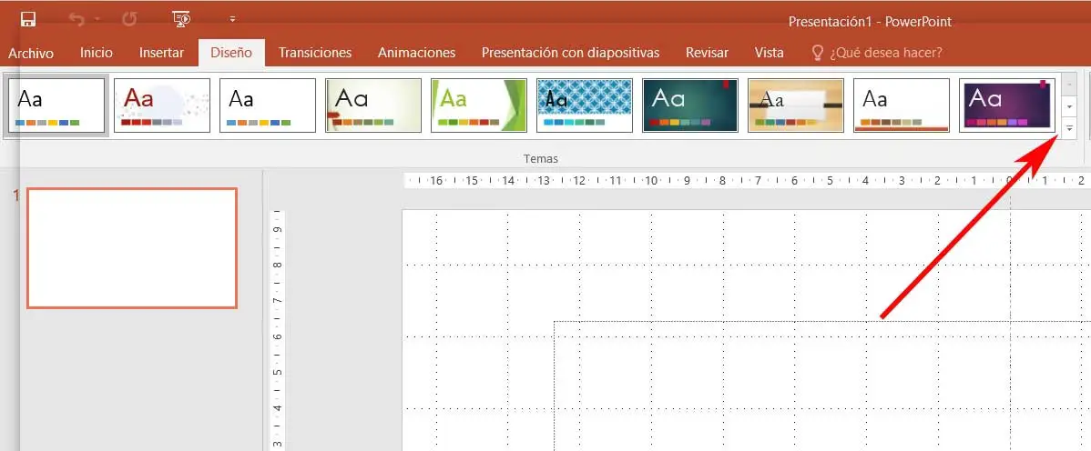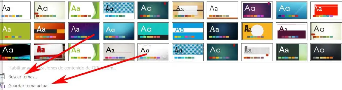 Mais ce qui nous intéresse ici, c’est d’en ajouter de nouveaux, par exemple le modèle que nous avons précédemment enregistré sur le bureau Windows . Eh bien, pour accéder à ce contenu spécifique, cliquez sur le petit bouton en forme de flèche vers le bas qui se trouve à droite des conceptions prédéfinies. Ce sera lorsque nous trouverons une option qui dit Rechercher des sujets. C’est celui qui n’intéresse pas vraiment ici, nous allons donc cliquer dessus. Ensuite, nous aurons la possibilité de choisir le modèle ou le thème que nous avions enregistré sur le bureau, afin qu’il se charge automatiquement.