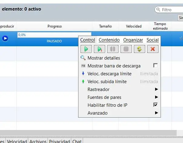 En même temps, il faut savoir que pour contrôler et gérer le torrent chargé ici, il suffit de cliquer dessus avec le bouton droit de la souris. À ce moment-là, une série d’options apparaîtra à l’écran dans un menu contextuel qui nous permet de suspendre le téléchargement, de le supprimer complètement, de voir les détails du torrent ou de définir ses limites de téléchargement et de téléchargement.