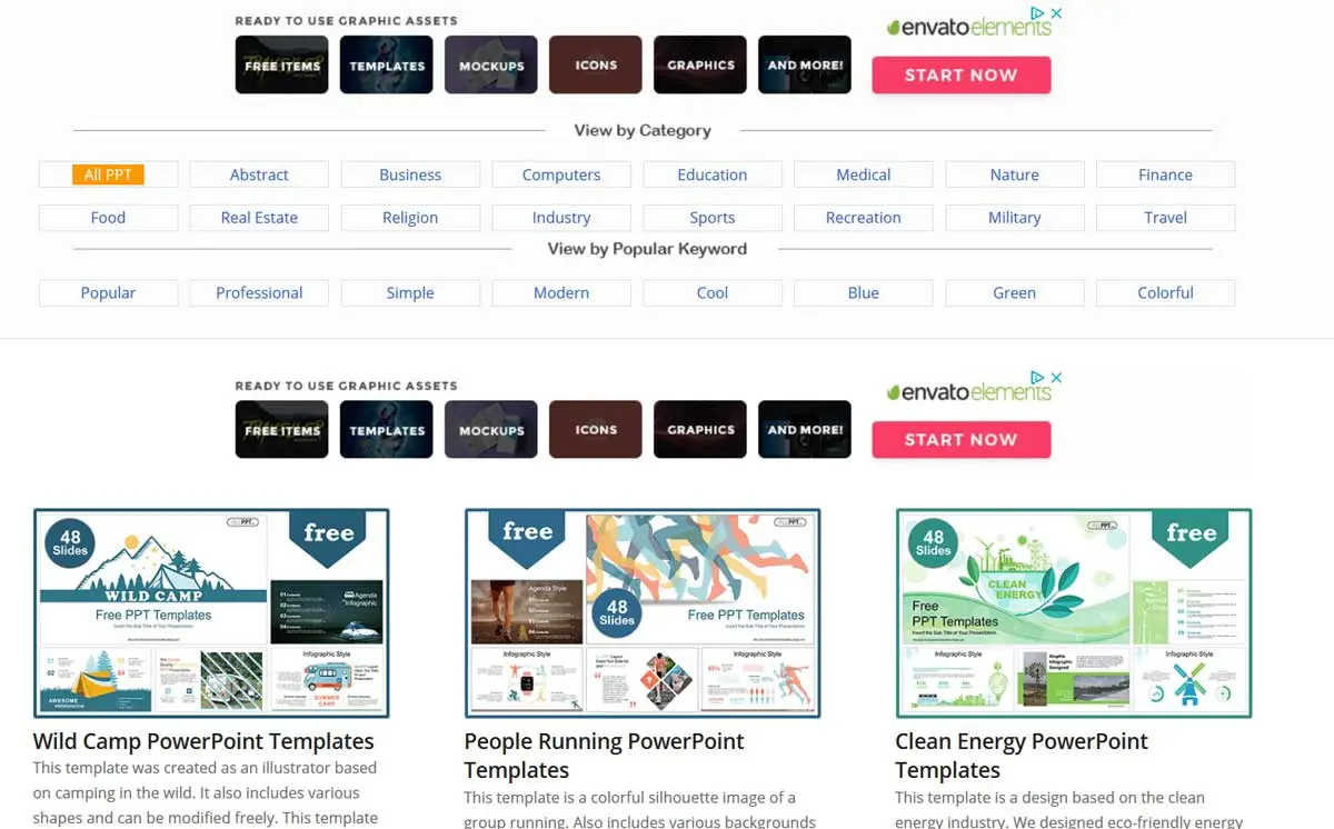 Dans ce cas, nous parlons d’une autre proposition de ce type à laquelle vous pouvez accéder à partir d’ici et qui présente également des modèles pour PowerPoint. La chose frappante ici est que l’interface principale, nous avons trouvé un bon nombre de catégories un peu moins courantes que celles que nous avons vues dans d’autres cas. De cette façon, nous pouvons accéder directement aux modèles liés à l’armée, à la religion, à la médecine, aux voyages , à la nourriture, aux thèmes abstraits, etc.