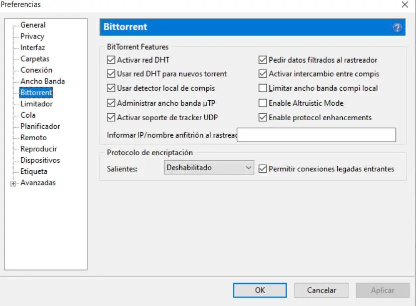 Il s’agit d’une section dédiée aux utilisateurs plus avancés ou à ceux qui ont de l’expérience dans l’utilisation des réseaux P2P avec BitTorrent. De cette façon, nous pouvons configurer de la meilleure façon la manière dont le programme interagira avec le reste des utilisateurs du même réseau . Et il faut garder à l’esprit que c’est précisément l’un des secrets du bon fonctionnement de ces réseaux P2P.
