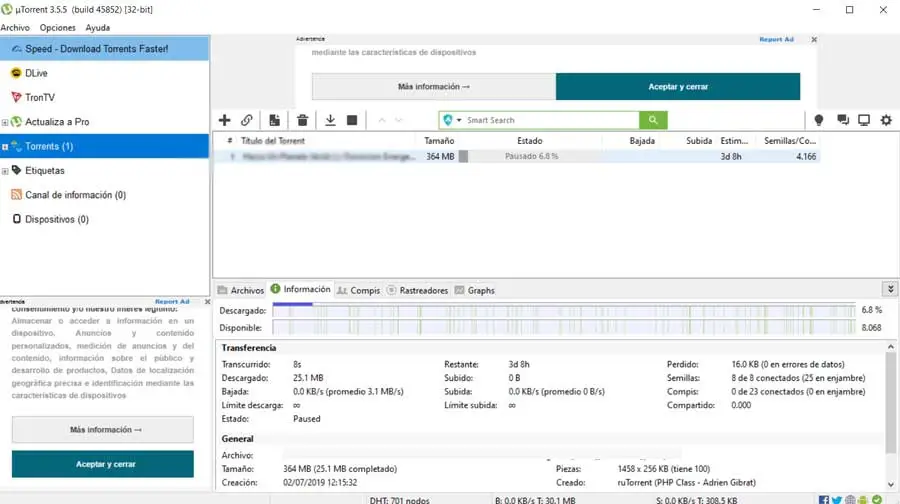 Quelque chose que nous devons garder à l’esprit est que uTorrent dans la première instance n’aura pas besoin de configuration supplémentaire pour fonctionner. Avec cela, ce qui est réalisé est que les moins expérimentés dans ces conflits peuvent travailler avec le programme et télécharger des torrents sans avoir à toucher à aucun paramètre. En fait, une fois que nous avons chargé le torrent dans son interface, il lancera le téléchargement automatiquement.