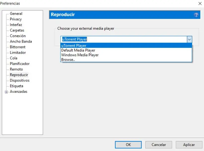 Si nous partons du principe qu’il s’agit d’un programme qui, en plus de nous permettre de télécharger des torrent, nous permet de reproduire directement ceux qui contiennent des vidéos. Dites qu’à partir de là, nous pouvons spécifier le lecteur que nous voulons utiliser pour cela, soit l’uTorrent interne, soit tout autre tiers.