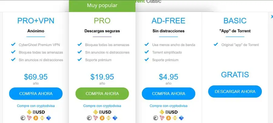 De cette façon, dans le cas dont nous parlons ici, ce que nous devons faire est d’accéder à ce lien . Il convient de mentionner à ce stade qu’à partir de là, nous avons la possibilité de télécharger à la fois uTorrent web et Classic, nous avons opté pour le second. En même temps, nous verrons que nous avons plusieurs propositions de paiement, en plus d’une gratuite, qui est celle qui nous intéresse, du moins au début. Cela nous donnera l’occasion de tester l’application et de décider plus tard si nous voulons obtenir une version payante.