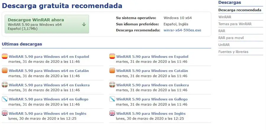 Ainsi, la première chose que nous devons faire est, depuis notre navigateur Internet préféré, de vous connecter au site Web officiel de WinRAR , où nous trouvons les téléchargements disponibles. Si nous allons dans l’onglet Téléchargements, nous trouvons la version la plus récente du programme en plusieurs langues. En même temps, nous pouvons opter pour l’ architecture 32 ou 64 bits , selon notre PC, il suffit donc de cliquer sur le lien correspondant.