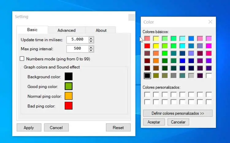 Dans l’onglet «Basic», nous pouvons configurer la fréquence à laquelle le programme doit mettre à jour le graphique . Par défaut, il est défini sur 5 000 millisecondes, ce qui équivaut à 5 secondes, et vous pouvez modifier cette valeur en ce que nous jugeons approprié. Si nous n’aimons pas les graphiques et préférons une valeur numérique, nous pouvons activer la case «Mode Numéros» et définir une valeur de ping de 0 à 99 , ce qui sera plus facile à lire pour nous que le graphique.