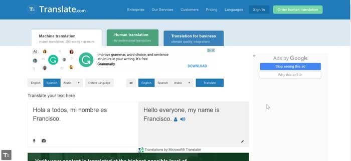 Nous pouvons tester Translate.com et vérifier ses résultats, car il s’agit d’une plate-forme entièrement gratuite.