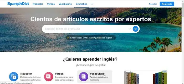 SpanishDict est une plateforme web pour apprendre, traduire de l’espagnol vers l’anglais et de l’anglais vers l’espagnol, la plus populaire au monde. Il possède le plus grand dictionnaire anglais du monde. Il inclut la possibilité de faire des conjugaisons pour chaque verbe et d’apprendre toutes sortes de vocabulaire facilement et efficacement. À partir de ce site Web, nous pouvons également apprendre toutes les règles de grammaire, ainsi qu’écouter des milliers de prononciations.
