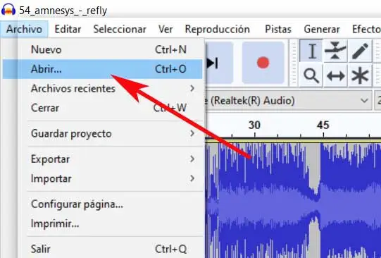 Ensuite, nous allons à l’option de menu Fichier / ouvrir, à partir de laquelle nous sélectionnons la chanson dont nous voulons supprimer les paroles . Nous faisons cela en naviguant vers le chemin du disque Windows et en sélectionnant le fichier correspondant. En même temps, nous pouvons également le faire glisser de l’Explorateur vers l’interface Audacity.