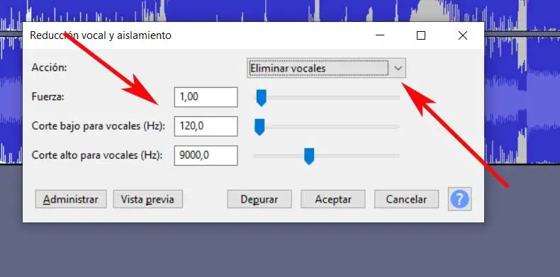 En même temps, nous avons d’autres options supplémentaires que nous pouvons configurer pour que le résultat final s’améliore. De cette façon, nous avons la possibilité de spécifier les Hz maximum et minimum des voix, ainsi que la force, au programme. Avec tout et avec ça, si vous n’êtes pas experts en la matière, nous vous recommandons de laisser les valeurs qu’Audacity nous présente par défaut pour éliminer la voix d’une chanson .