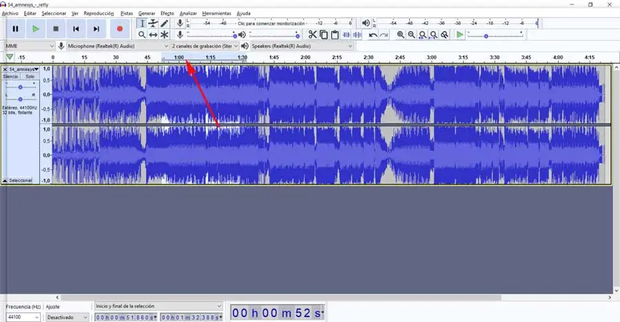 Une fois que nous l’avons chargé dans le programme, nous devons identifier si le morceau que nous avons chargé a les voix dans un ou deux canaux . Quoi qu’il en soit, nous devons identifier l’endroit dans la piste audio chargée où la voix apparaît. Après cela, nous devons sélectionner cette partie de la piste en la faisant glisser avec le pointeur de la souris, ou en appuyant sur Ctrl + A pour tout sélectionner.