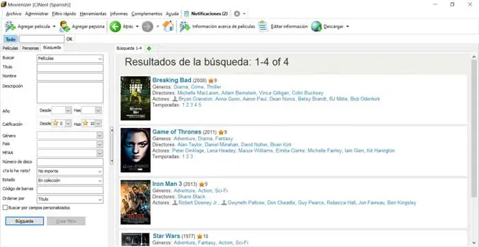 Movienizer est un logiciel complet idéal pour les cinéphiles, avec lequel nous pouvons créer une encyclopédie de toute notre collection de films. Cette application nous permettra de cataloguer l’ensemble de notre collection de films , ainsi que nos acteurs préférés et même de garder une trace de ceux que nous avons empruntés. Pour cela, ce programme se charge de trouver toutes les informations dans IMDB, l’une des plus grandes bases de données sur le cinéma sur Internet, afin que nous puissions obtenir rapidement et avec précision toutes les données dont nous avons besoin pour chacun de nos films.