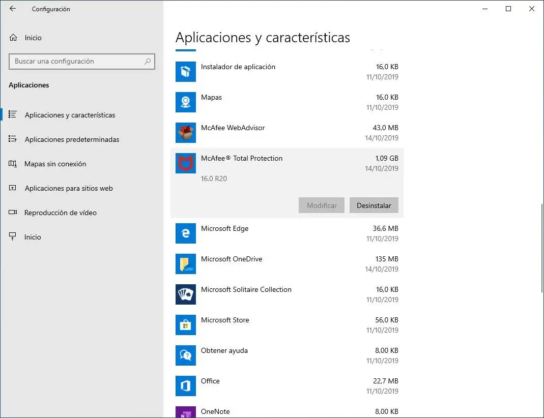 Este antivirus se puede desinstalar de Windows 10 como cualquier otra aplicación. Es decir, podemos ir al apartado de Configuración de Windows 10, ir al apartado «Aplicaciones» y, dentro de «Aplicaciones y características» buscamos la entrada de McAfee, como cualquier otra aplicación.