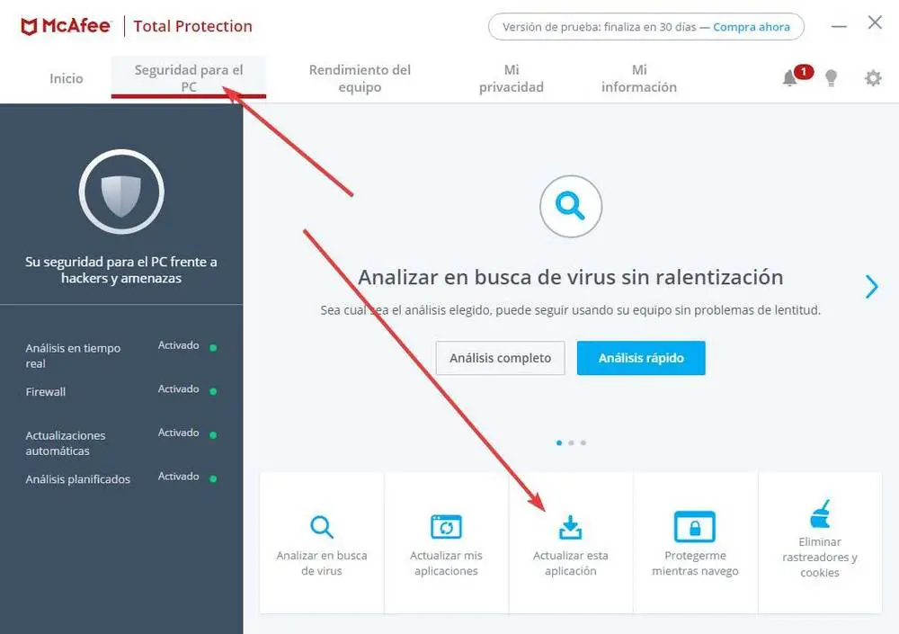 McAfee también se encarga, por defecto, de bajar las nuevas bases de datos de virus de manera automática. Nosotros no tendremos que preocuparnos por estas actualizaciones. Si queremos controlar el estado de las mismas, podemos hacerlo desde la ventana principal del programa, entrando en el apartado «Seguridad para el PC«, y eligiendo la opción «Actualizar esta aplicación«.