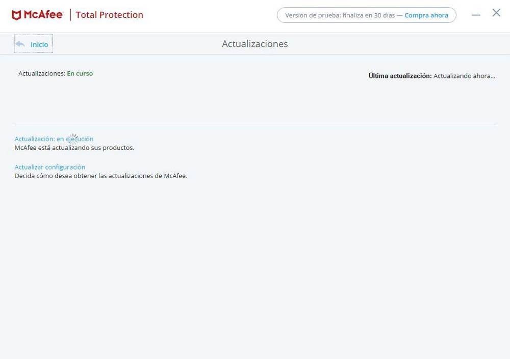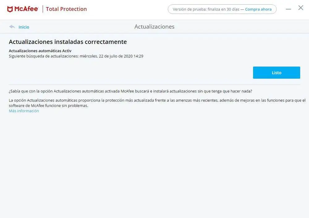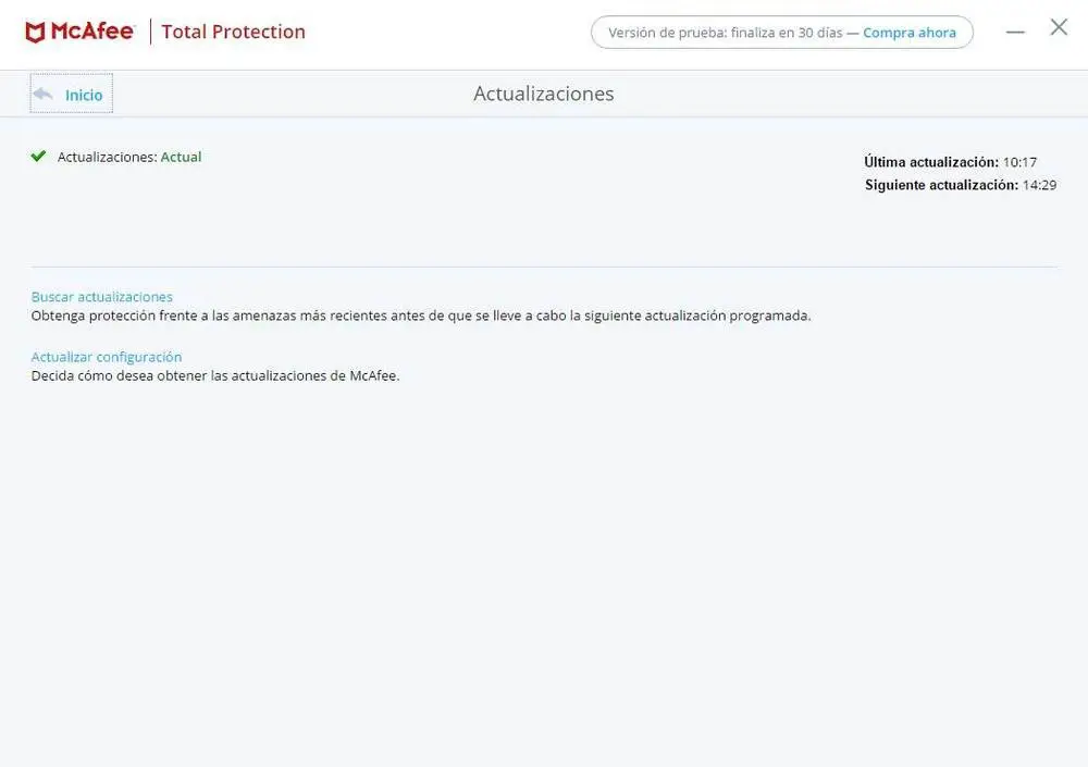 En ella vamos a poder ver el estado de las actualizaciones de McAfee, la fecha de la última actualización, la fecha de la próxima, así como un botón en la parte inferior para buscar y bajar nuevas versiones y configurar estas actualizaciones automáticas.