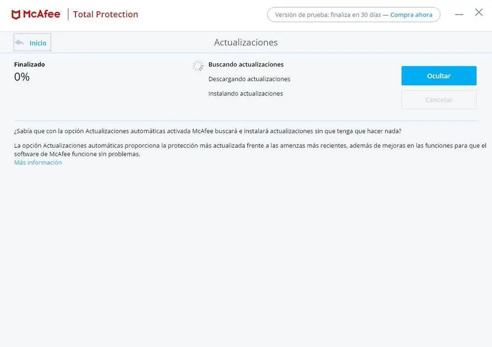 Si ya tenemos instalado McAfee en nuestro ordenador, las nuevas versiones del programa se descargarán automáticamente sin que nosotros tengamos que hacer nada. Este antivirus busca periódicamente nuevas versiones de las bases de datos, y de los propios componentes del programa, y se encarga de bajarlos e instalarlos de manera automática.