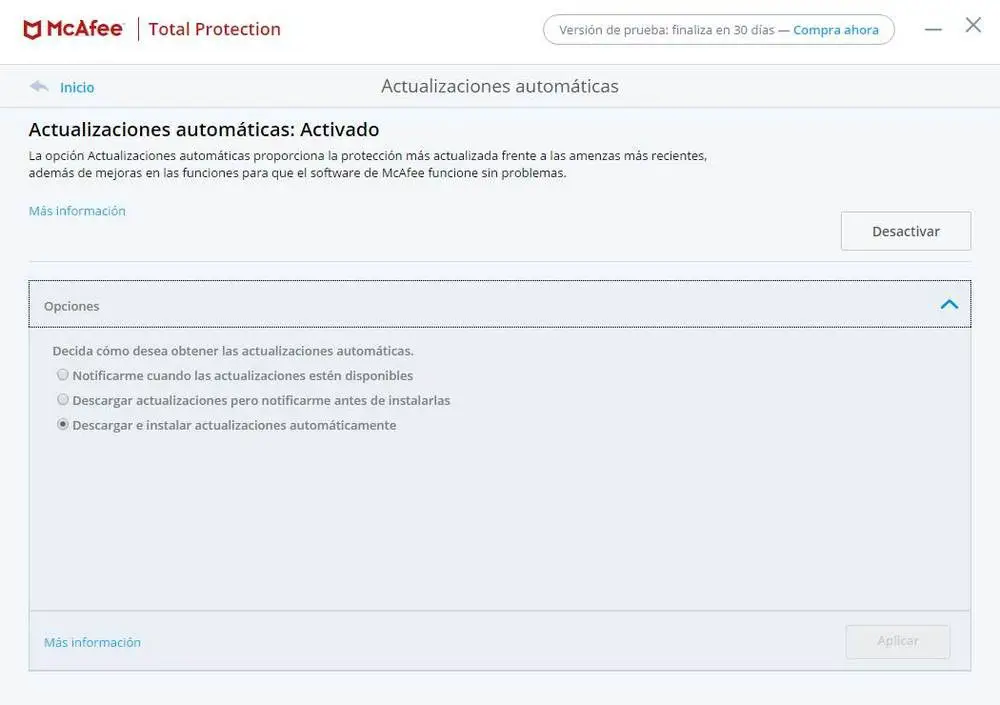 Aunque no vamos a tener muchas opciones para configurar, McAfee nos va a permitir desactivar las actualizaciones automáticas con un clic (aunque no lo recomendamos) y elegir cómo queremos que se comporten estas actualizaciones: