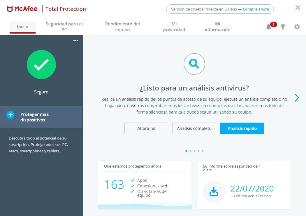 McAfee es uno de los antivirus más populares para proteger Windows y dispositivos. Seguro que más de una vez hemos oído hablar de este software de seguridad, sobre todo cuando compramos un ordenador nuevo. Intel tiene el 49% del capital de esta firma de seguridad, por lo que suele ser uno de los antivirus que suele venir instalado por defecto en los PCs nuevos, junto a una versión de prueba de 60 días.