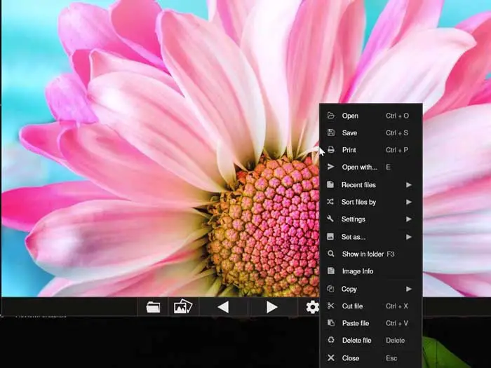 PicView también tiene disponible un menú contextual, que podemos acceder pulsando con el botón derecho del ratón sobre su interfaz. Desde este menú podemos abrir o guardar imágenes, ver los archivos recientes, ordenarlos por nombre, tamaño, fecha, formato o último acceso. Desde el menú de configuración (settings) podemos mostrar u ocultar la interfaz y alternar con un modo de desplazamiento automático en bucle. Otras opciones disponibles es la posibilidad de configurar una imagen como fondo de pantalla, ver la carpeta donde está ubicada la imagen, copiar, pegar o eliminar una imagen, así como ver sus propiedades.