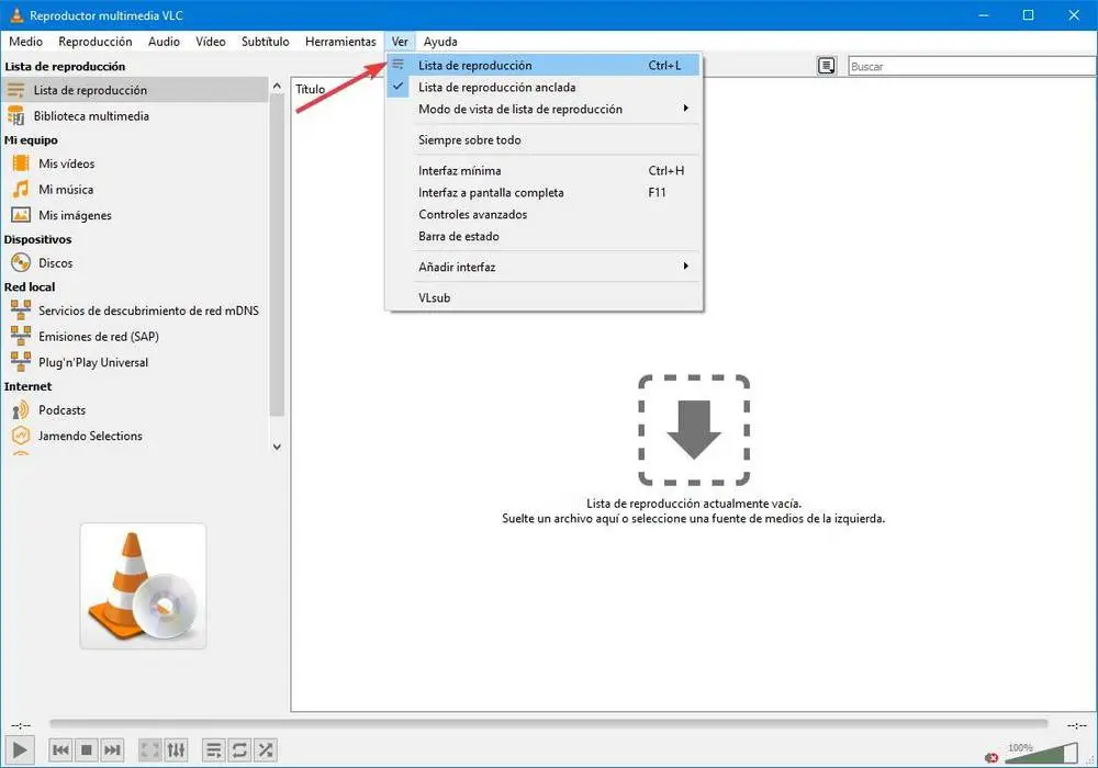 Cette playlist, par défaut, est masquée. Mais nous pouvons le montrer très facilement. Pour ce faire, il suffit de cliquer sur le menu «Affichage», ou simplement d’appuyer sur le raccourci clavier Ctrl + L pour l’afficher.