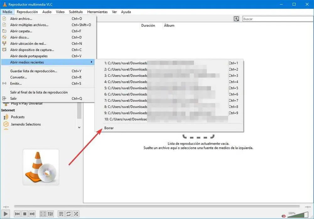 Dans ce cas, il faut aller dans le menu «Médias»> «Ouvrir les médias récents» , et nous trouverons la liste. En bas, nous pouvons voir un bouton qui nous permettra de supprimer facilement cette liste.