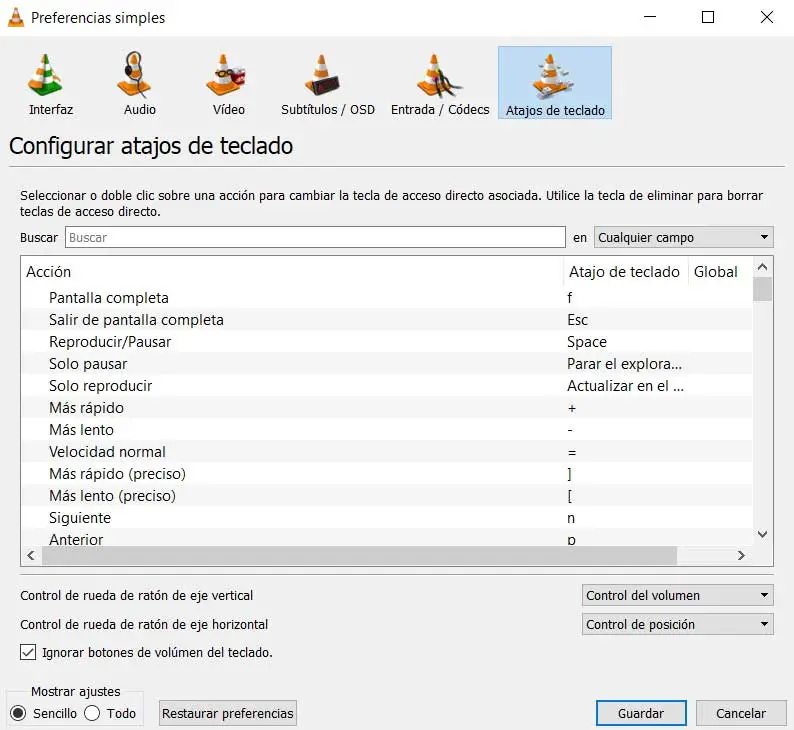 Il est également important de savoir que pour gérer cette application de la manière la plus efficace, elle nous propose une série de raccourcis clavier prédéfinis. Ceux-ci nous donnent accès aux options de menu et aux fonctions les plus courantes pour nous gérer plus rapidement. Bien sûr, il est important de savoir que ceux-ci peuvent être personnalisés à partir de leur onglet correspondant, pour établir les raccourcis souhaités, ainsi que pour ajuster le comportement de la souris dans VLC .