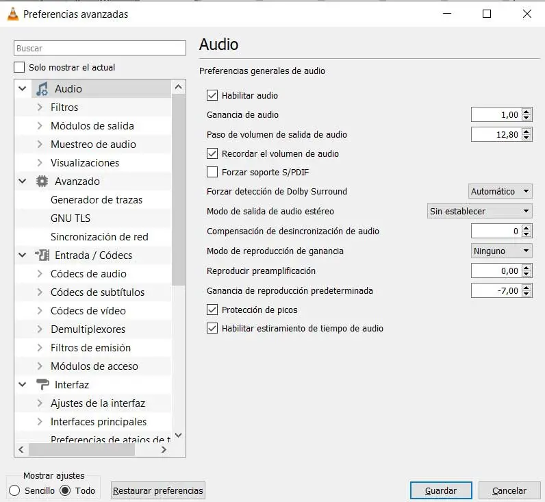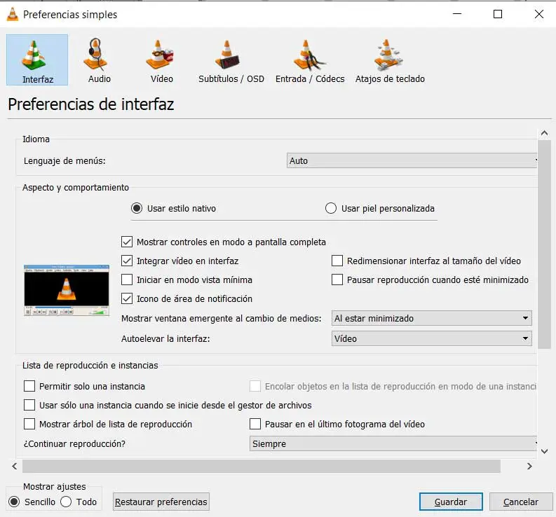 Cela conduit à une nouvelle fenêtre indépendante vers l’interface principale où, en haut, nous trouvons un total de six onglets. Celles-ci font référence aux aspects globaux que le programme nous permet de «peaufiner» et de personnaliser à partir d’ici. Ainsi, dans la fenêtre, nous voyons des catégories qui se réfèrent à l’interface, à l’audio, à la vidéo, aux codecs , aux sous-titres et aux raccourcis clavier . Comme son nom l’indique, chacun de ces onglets nous donnera accès à une série de fonctions liées à chaque catégorie mentionnée.