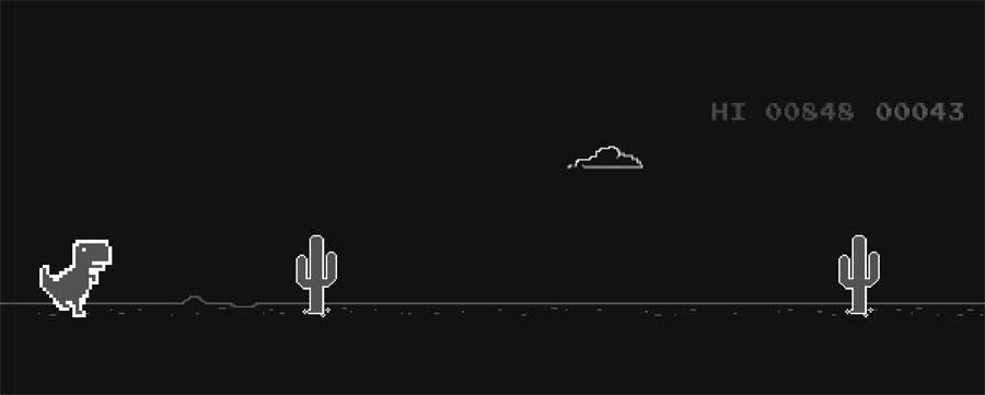 En revanche, dans cette seconde alternative au jeu de dino de Chrome, on trouve un drôle de vaisseau ou avion sans ailes qui tente d’éviter une série de cactus éparpillés sur le sol.