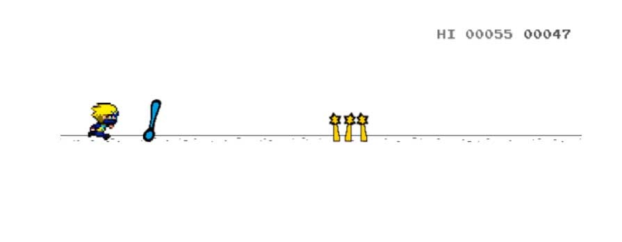 Ici, au lieu d’un dinosaure comme dans le jeu original, nous trouvons un personnage particulier qui suit le même thème que celui discuté ci-dessus.