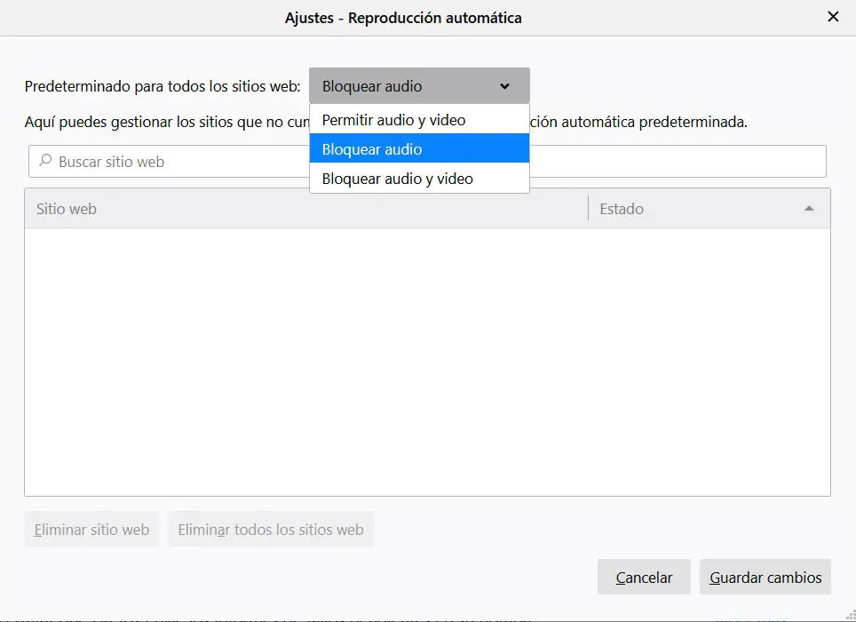 Ici, nous verrons que nous avons trois options prédéfinies: bloquer l’audio et la vidéo, uniquement l’audio, ou autoriser l’ audio et la vidéo , afin que nous puissions inclure plus tard les URL que nous voulons personnaliser.