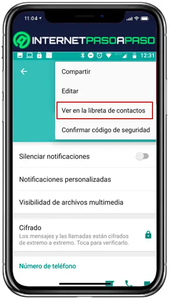 - Une fois sur la carte de contact, appuyez à nouveau sur les trois points. Mais cette fois, choisissez «Afficher dans le carnet de contacts» .