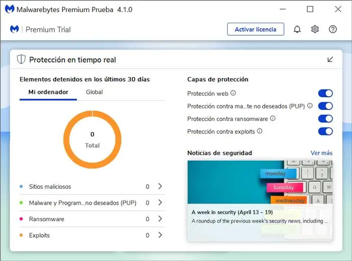 Depuis le menu principal, nous avons également une protection en temps réel qui par défaut est activée toutes ses fonctions mais que nous pouvons désactiver ou réactiver à notre guise. De cette façon, nous avons une protection Web, une protection contre les logiciels malveillants, une protection contre les ransomwares et une protection contre les exploits. Si nous cliquons dessus, nous pouvons voir les éléments arrêtés au cours des 30 derniers jours.