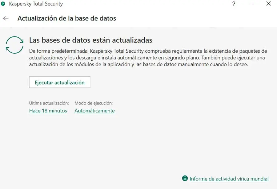 À ce stade, il est important de savoir que la base de données des logiciels malveillants doit être à jour à tout moment. Et c’est que les types de codes malveillants qui apparaissent ne cessent de croître. C’est pourquoi en même temps, périodiquement, nous vous recommandons d’utiliser l’option Mettre à jour la base de données. Vous le trouverez également dans l’interface principale de la suite Kaspersky.
