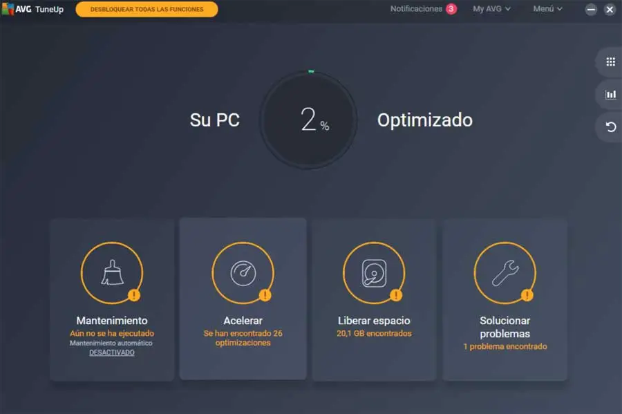 Par conséquent, lors de l’installation de cette application sur notre ordinateur, nous obtiendrons une série de fonctions qui nous aideront grandement. En fait, ceux-ci visent à nous permettre d’améliorer les performances générales de Windows , et donc de notre ordinateur. C’est quelque chose que nous pourrons voir de première main dès que nous lancerons l’application. Nous vous disons cela car dès le démarrage d’AVG TuneUp, dans son interface principale, nous trouvons plusieurs fonctions de base qui nous mènent à cette fin.