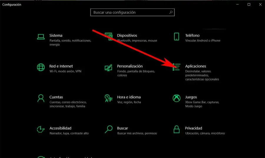 Eh bien, pour y parvenir, la première chose que nous allons faire est d’accéder à l’application de configuration du système lui-même. C’est quelque chose que nous réalisons grâce à la combinaison de touches Win + I , puis à l’option Applications.