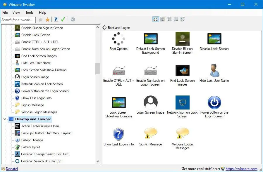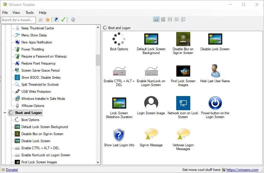 Ensuite, nous arrivons à la section « Boot and Logon ». Windows nous rend très difficile la personnalisation de ces aspects du système d’exploitation, mais grâce à Winaero Tweaker, nous pouvons le faire sans aucune difficulté.
