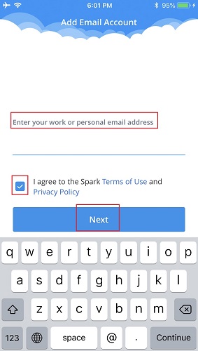 - Saisissez votre adresse e-mail personnelle ou professionnelle. Gardez à l’esprit que dans ce champ, vous devez ajouter l’adresse e-mail du compte que vous souhaitez synchroniser avec Spark. Cliquez sur » Suivant».