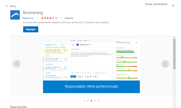 D’un autre côté, si vous recherchez un module complémentaire qui vous permet de remettre à zéro votre plateau et de vous éloigner un peu du courrier électronique sans avoir à recevoir constamment des messages, vous pouvez commencer à utiliser l’addon Boomerang, un outil classé avec 4 étoiles et qui a un grand nombre d’utilisateurs actifs.