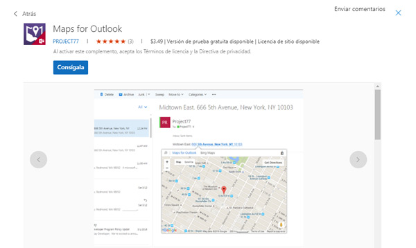 Une autre extension que nous trouverons disponible pour la messagerie est Maps for Outlook, un addon qui est payant, mais qui est considéré comme l’un des meilleurs, il est noté 5 étoiles par ses utilisateurs. donc, avec cet outil, vous aurez la possibilité de voir des cartes et des directions directement à partir de votre email
