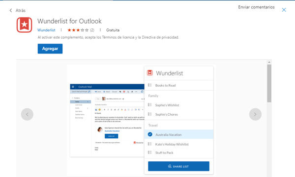 Dans ce cas, Wunderlist est associé à votre e – mail Outlook et vous pouvez ainsi commencer à exécuter chacune de vos tâches en attente, qu’il s’agisse d’ envoyer les e-mails que vous avez laissés en brouillon, d’envoyer des e-mails à la liste des tâches , entre autres. Un outil très intéressant qui vous évitera d’oublier quelque chose en attente.