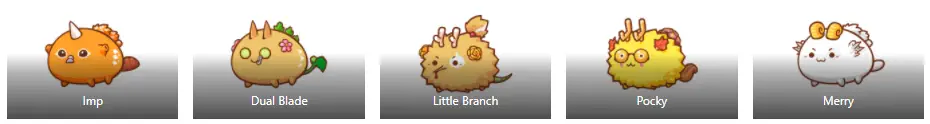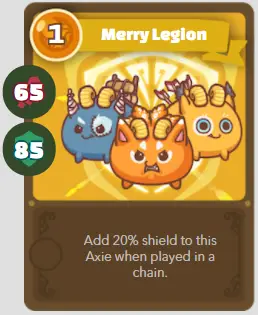 | ré | Joyeux | Joyeuse légion | 1/65/85 | Ajoute 20% de bouclier à cette Axie lorsqu’elle est enchaînée. |