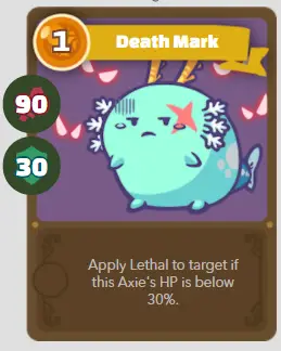 | ré | Baiser d’Axie | Marque de la mort | 1/100/30 | Applique Létal à la cible si les PV de cet Axie sont inférieurs à 30%. |